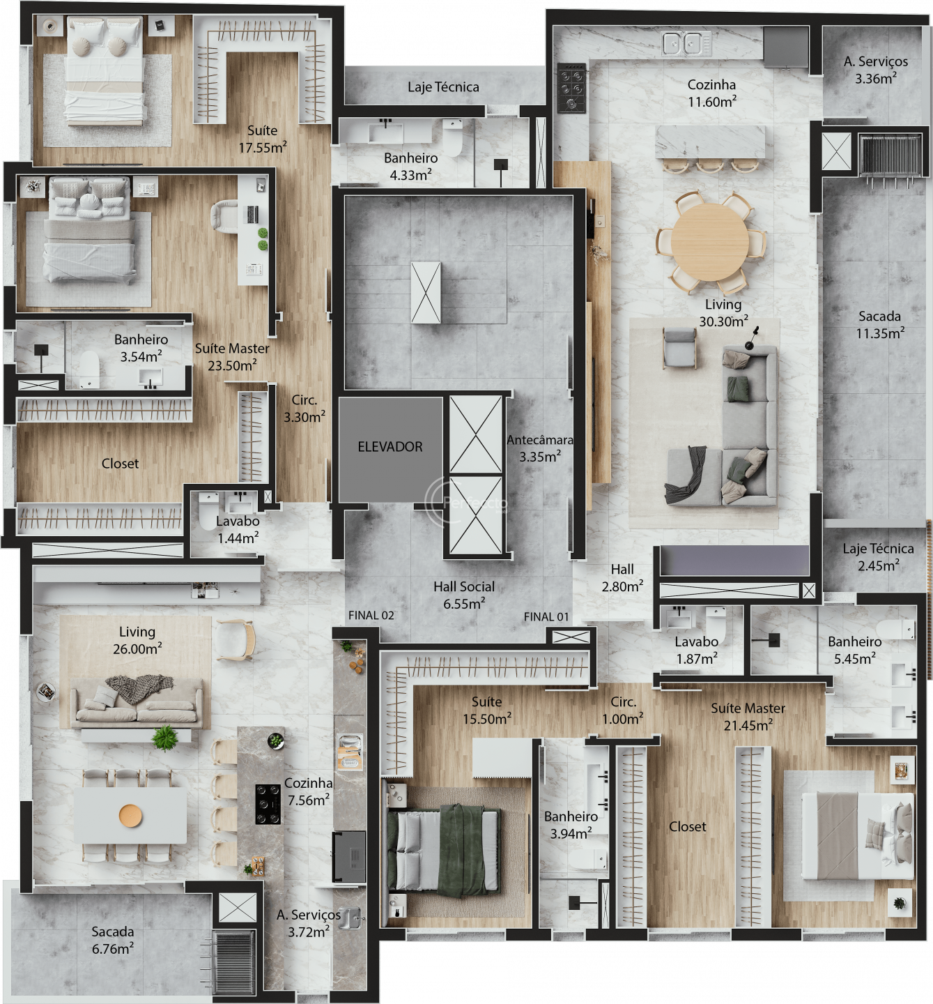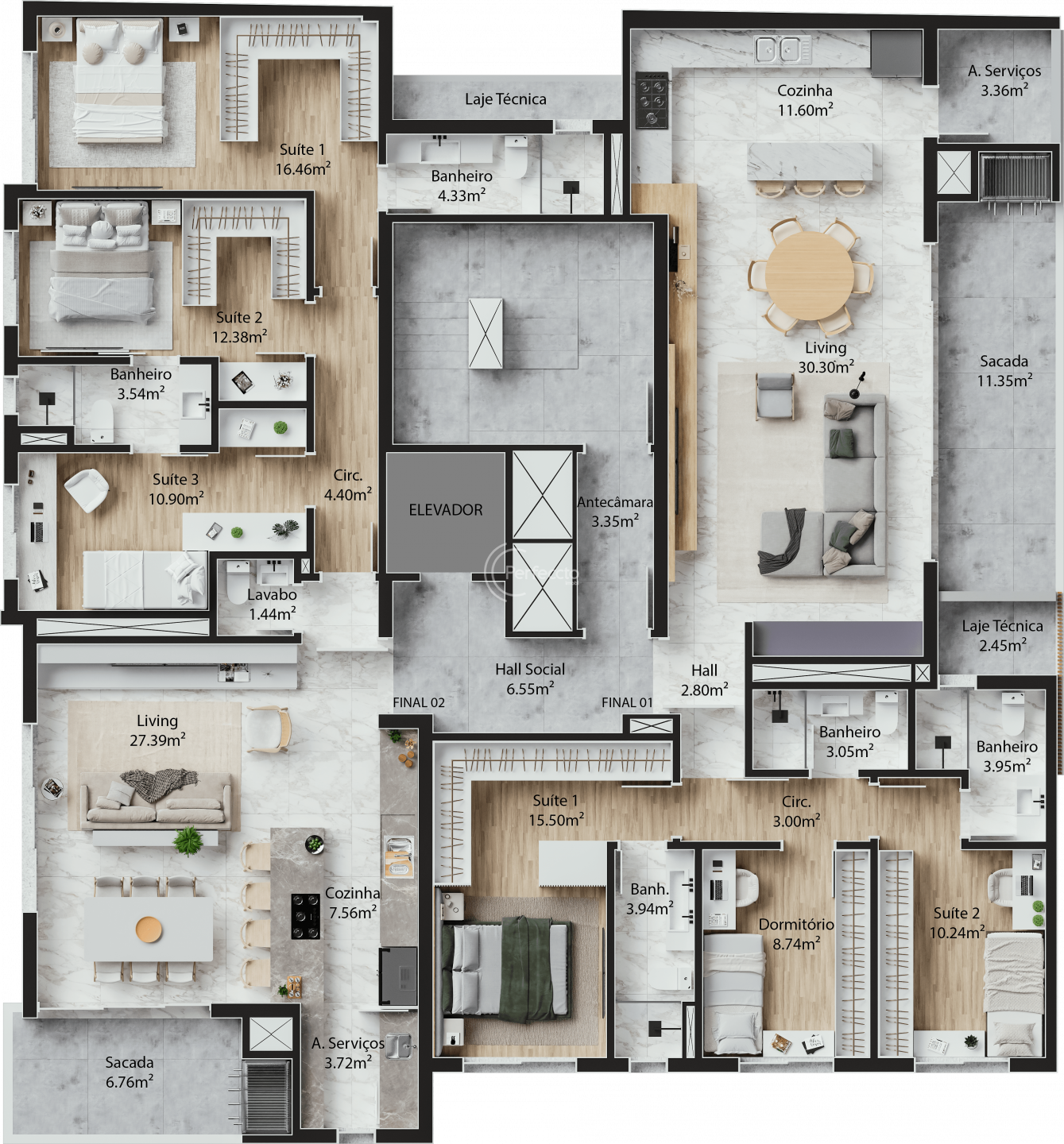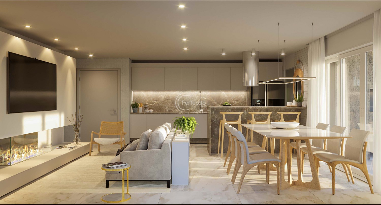 São apartamentos de 118 a 130m² privativos