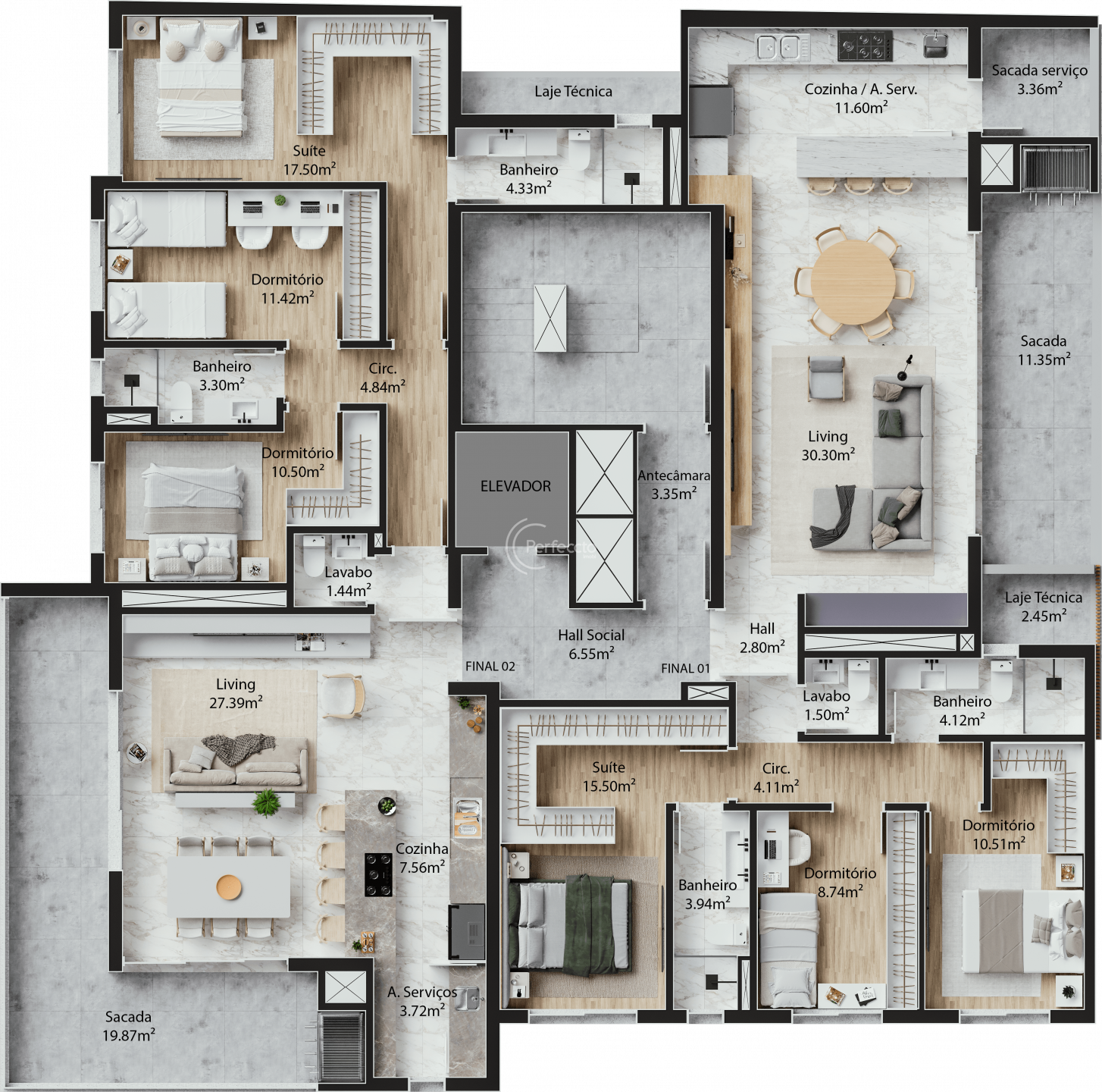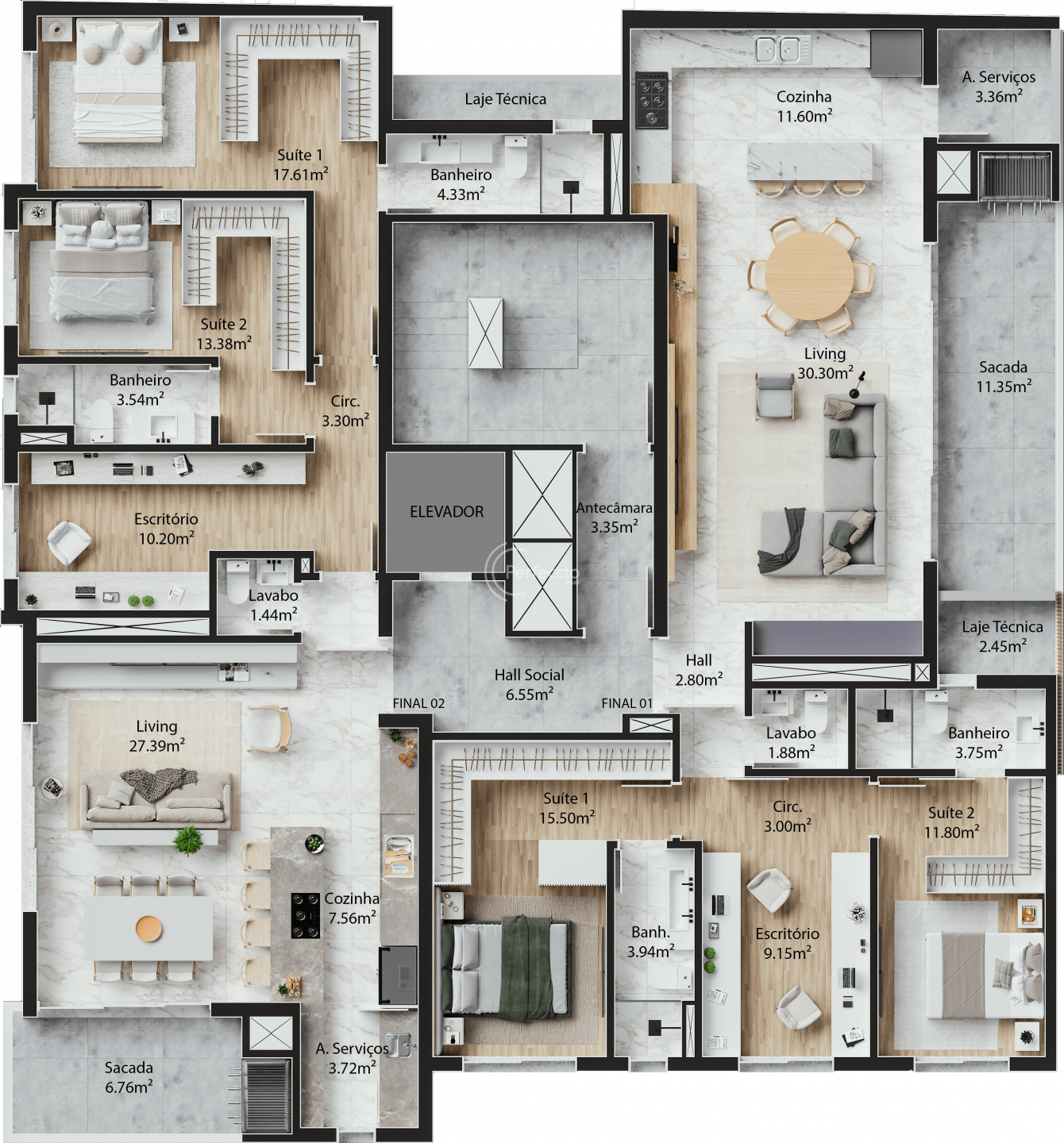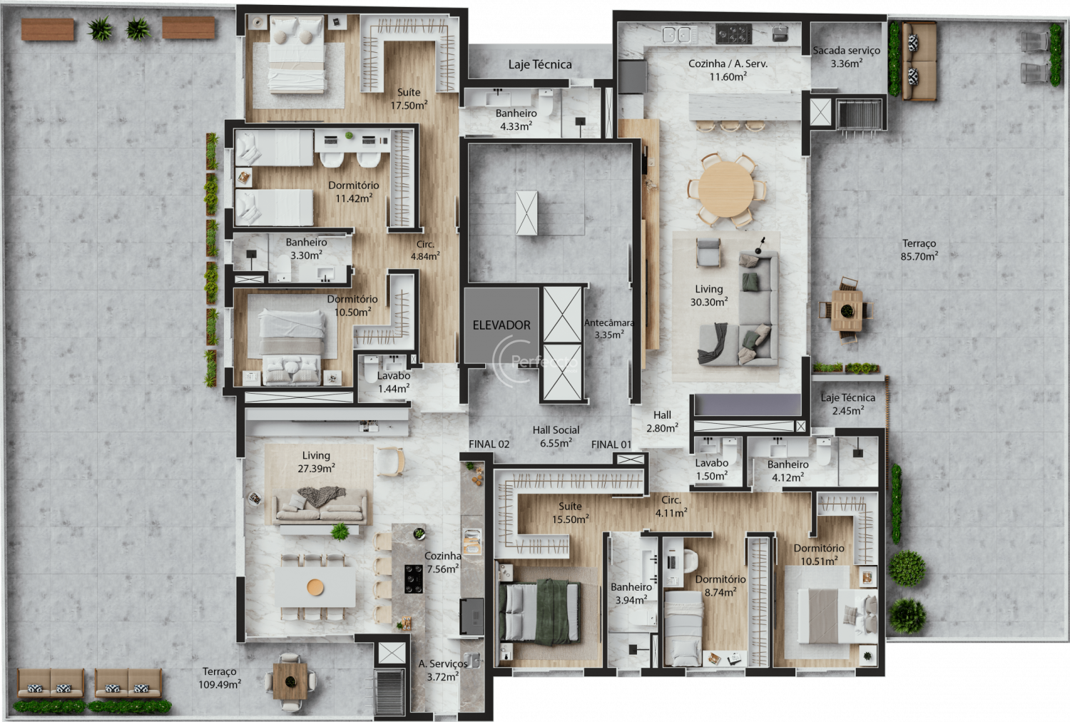 São apartamentos de 118 a 130m² privativos